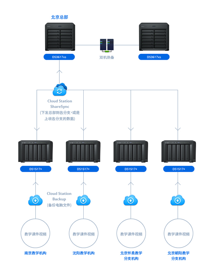 其次,采購(gòu)了300臺(tái)DS1517+(8GB)在全國(guó)各地的教育培訓(xùn)機(jī)構(gòu)辦公地點(diǎn)設(shè)立,并與總部的DS3617xs實(shí)現(xiàn)異地?cái)?shù)據(jù)互通,打破信息孤島,實(shí)現(xiàn)數(shù)據(jù)互通,提高效率。