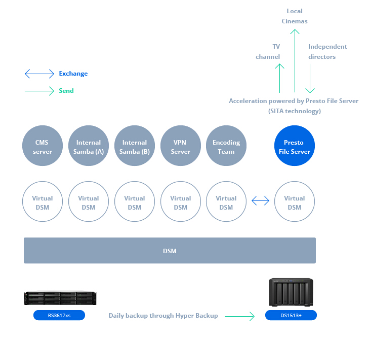 這一次,它購(gòu)買(mǎi)了 RS3617xs,以 12 塊 10TB HDD 組成了 RAID 6,隨后針對(duì)設(shè)備上運(yùn)行的 Virtual DSM 構(gòu)建了 6 個(gè)完全隔離的虛擬實(shí)例,用于 所需要的不同用途,每個(gè)實(shí)例配備自己的 VLAN,以滿足 MPAA(美國(guó)電影協(xié)會(huì))對(duì)不同設(shè)備的不同網(wǎng)絡(luò)可訪問(wèn)性的安全規(guī)定。