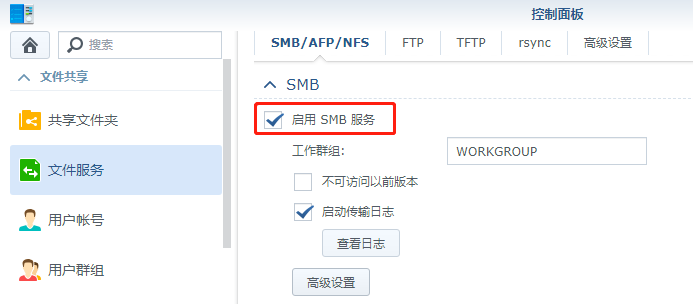 2、在控制面板>文件服務(wù)>啟用SMB服務(wù)